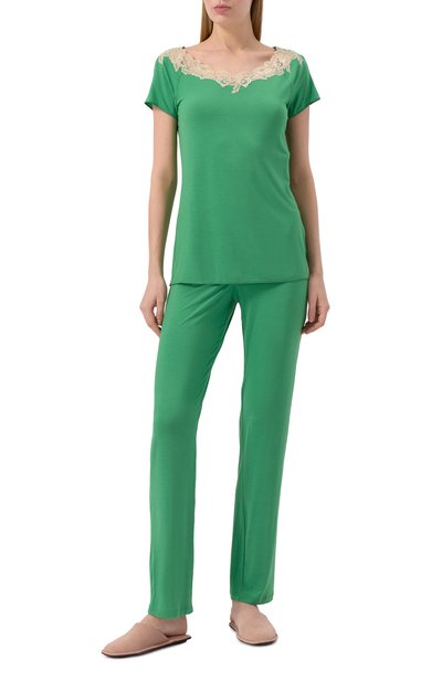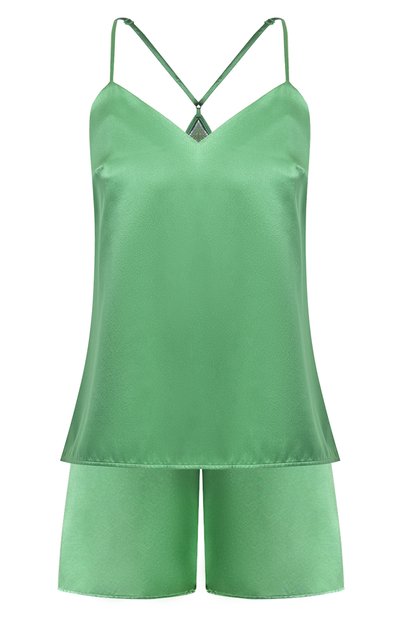 Пижама оттенка свежей травы объединила в себе красоту и комфорт. Для пошива изделий использовали практически невесомый шелковый атлас стрейч с выразительным блеском. Шорты дополнили эластичной вставкой на поясе сзади. Топ с узкими регулируемыми бретелями украсили фигурной кружевной аппликацией на спинке.