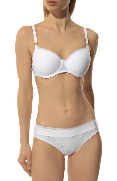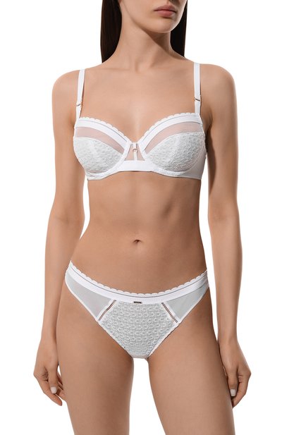 Для изготовления белых слипов использовали гладкий текстиль и полупрозрачное кружево с цветочным узором. Спереди трусы украсили ажурной окантовкой Leavers. Эластичные материалы, сертифицированные Oeko-Tex, обеспечивают удобную посадку по фигуре.