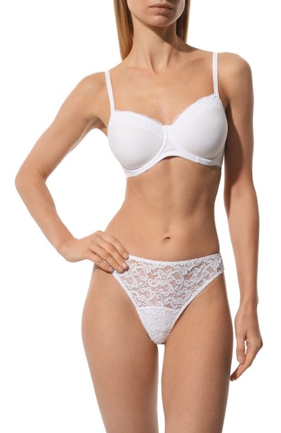 Белые трусы-танга изготовили из изысканного полупрозрачного кружева с цветочным мотивом. Материал, сертифицированный Oeko-Tex, исключительно приятно ощущается на теле и безопасен для кожи, а за счет волокон эластана в составе изделие комфортно облегает фигуру. Края украсили ажурной каймой Leavers.