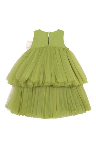 Для изготовления платья Lulla яркого неоново-желтого оттенка использовали сетчатый тюль. На прилегающем лифе с полупрозрачными бретелями и пышном расклешенном подоле материал собрали в объемные складки. Спереди разместили крупный бант из сияющего текстиля. Модель застегивается молнией сзади.