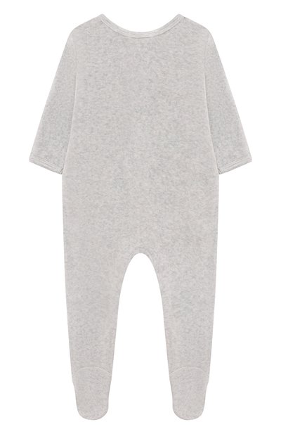 Комбинезон с цельнокроеными ползунками выполнили из нежного хлопкового велюра. Спереди и вдоль шагового шва расположили кнопки. На груди вышили фирменную эмблему.