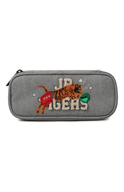 Серый прямоугольный пенал с округлыми краями выполнили из прочного полиэстера. На клапане разместили разноцветную аппликацию в виде тигра с боксерской атрибутикой. Также модель украсили логотипом бренда. Внутри аксессуар дополнили эластичными креплениями для карандашей.