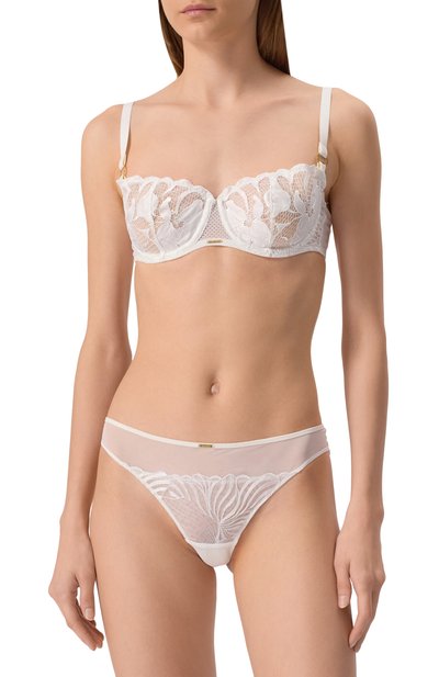 Для создания белых слипов с узором в тон использовали легкий полупрозрачный тюль, который почти не ощущается на теле, комфортно тянется и хорошо пропускает воздух. Спереди трусы из коллекции Graphic Allure дополнили вставкой из гладкого однотонного материала.