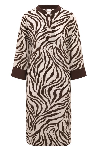 Пляжная туника из шелкового крепдешина почти ничего не весит и позволяет воздуху и влаге свободно циркулировать. С коричневым зебровым принтом на нежной ткани гармонируют однотонные манжеты на рукавах 3/4, воротник «мандарин» и завязки, которые фиксируют глубокий узкий вырез. Свободная модель со спущенной линией плеч дополнена высокими боковыми разрезами.