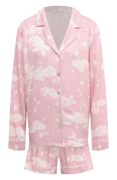 Светло-розовую пижаму с белым принтом в виде звезд, полумесяца и пушистых облаков сшили из нежного шелка. Приятный на ощупь материал хорошо пропускает воздух и создает ощущение прохлады на коже. Отвороты на шортах с эластичным поясом и манжетах длинных рукавов украсили узким рельефным кантом.