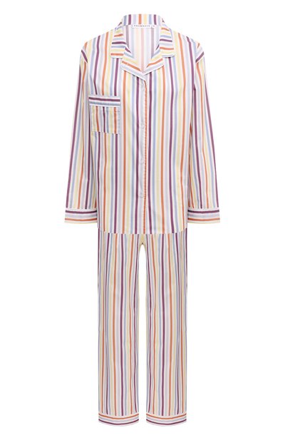 Легкий дышащий хлопок в разноцветную полоску делает свободную пижаму яркой и очень комфортной. Мягкая ткань с добавлением стрейчевых волокон хорошо тянется, не выцветает со временем и надолго остается гладкой. Направление рисунка меняется на нагрудном кармане и широких манжетах, которыми дополнены рукава рубашки и низ брюк с эластичным поясом.
