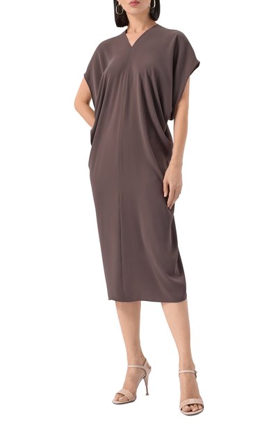 Короткое платье приглушенного розового цвета сшили из фактурной отборной шерсти. Она почти не мнется и держит форму, сохраняя объемными складки на расклешенном подоле. Подкладку выполнили из эластичного шелка. На лифе спереди сымитировали запах, сформировав глубокий V-образный вырез. Линию талии подчеркнули широким поясом в тон модели. Изделие застегивается сзади потайной молнией.