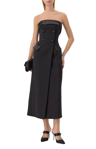 Миди-платье делают романтичнее акварельный цветочный принт и облегающий силуэт с корсетным лифом и открытыми плечами. Модель из атласа на основе полиэстера застегивается молнией сзади.