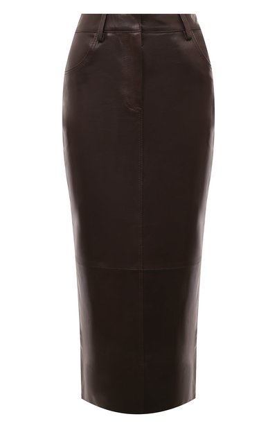 Юбку цвета горького шоколада сшили из тонко выделанной пластичной кожи, поэтому она комфортно облегает фигуру, а шлица сзади обеспечивает свободу движений. Модель с высокой посадкой дополнили четырьмя карманами и шлевками для ремня. Изделие застегивается молнией и потайным крючком.