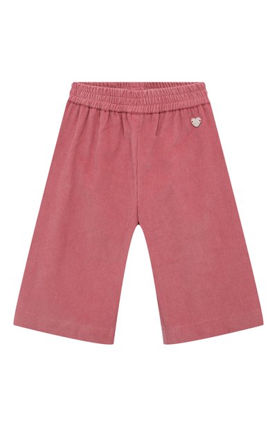 Для пошива свободных брюк использовали вельвет из чистого хлопка, не вызывающего аллергию. Сбоку расположили фирменную пластину в форме сердца. Модель с широким эластичным поясом обходится без застежек.