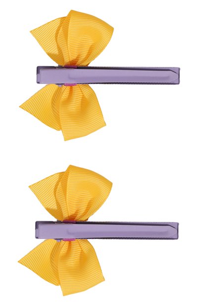 Яркую заколку-зажим выполнили из прочного металла с градиентным покрытием в оранжевых тонах. Для декора модели, надежно удерживающей небольшие пряди, выбрали голубой бант из фактурной ленты грогрен со скошенными концами. В комплекте есть еще один такой же аксессуар.