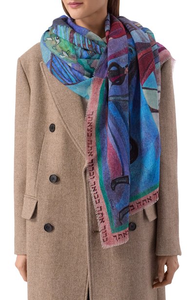 Полупрозрачный палантин из тонкой шерсти с мотивом под зебру дополнили широкой однотонной каймой с логотипом. Необработанные края аксессуара подчеркнули короткой бахромой.