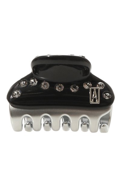 Черную заколку-краб выполнили вручную из легкого ацетата из древесной целлюлозы и хлопка. Модель среднего размера декорировали дорожкой из прозрачных кристаллов Swarovski и миниатюрной эмблемой. Запатентованный плавный зажим в сочетании с крупными серебристыми зубцами хорошо фиксируют и объемные, и небольшие пряди.