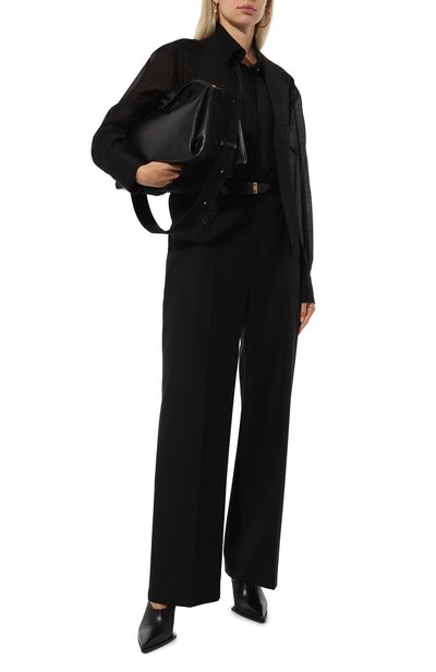 Черная лаконичная рубашка с легкостью впишется в повседневные комплекты любой степени сложности. За комфорт в течение дня отвечает свободный силуэт и тонкий смягченный лен, идеально пропускающий воздух, поэтому в изделии будет комфортно даже в жару. Низ дополнили узкими шнурами, которыми можно сформировать эффект запаха и акцентировать талию.