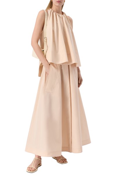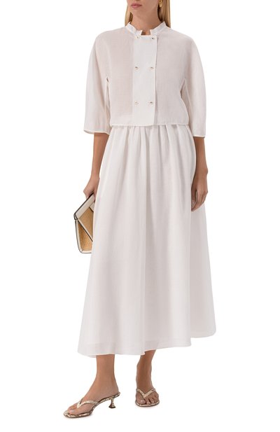 Длинная белая юбка в исполнении Александра Терехова подойдет для жары. Для пошива модели с боковыми карманами, которая будет уместно смотреться и в городе, и на морском побережье, дизайнер выбрал тонкий легкий лен. Мягкая ткань отлично пропускает воздух и едва ощущается на теле, а расклешенное изделие из нее создает в движении летящий силуэт.