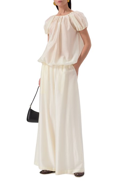 Нарочито широкие брюки оттенка white mother of pearl впишутся в непринужденный образ. Модель выполнили из немного просвечивающего микса вискозы и полиэстера. Благодаря поясу-кулиске изделие не нуждается в застежках.
