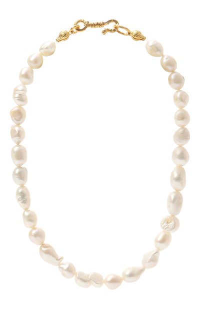 На основу колье Venus II вручную нанизали барочные жемчужины. Застежку-крючок нарочито неровной формы выполнили из бронзы с покрытием золотом 999-й пробы.