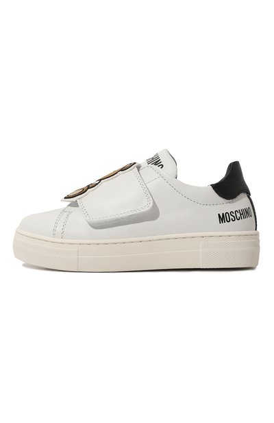 Низкие кеды выполнили из гладкой кожи. Шнурки заменили двумя ремешками велкро. Задник подчеркнули тисненым логотипом бренда, а сбоку нашили фактурную аппликацию в виде эмблемы. Пару установили на широкую подошву, слегка пружинящую каждый шаг.