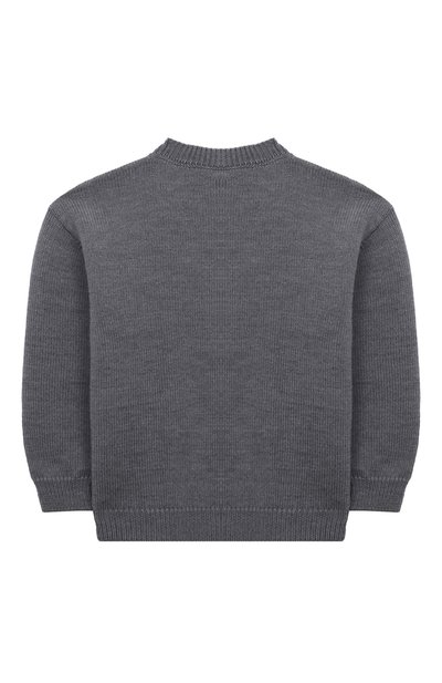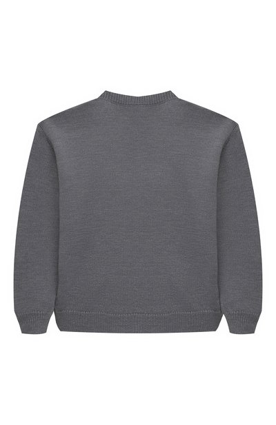 Меланжевый пуловер связали из шерстяной пряжи. В состав добавили кашемир, поэтому гипоаллергенный трикотаж получился мягким и безопасным для чувствительной кожи ребенка. Свободную модель украсили контрастным логотипом, выполненным в технике жаккард.