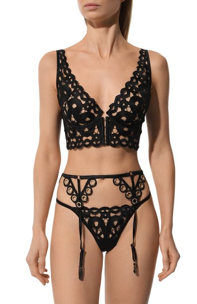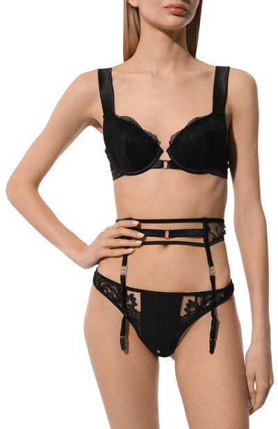Пояс из линии Abbesses выполнили из полупрозрачного кружева. Белье, застегивающееся плоской пряжкой сзади, дополнили золотистыми брендированными кольцами на регулируемых узких пажах с фигурными зажимами.