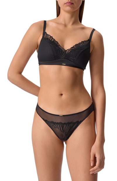 Трусы-танга из атласа декорировали вставками из тюля и отделкой из цветочного гипюра с фестончатым краем. Модель дополнили дышащей хлопковой ластовицей, поэтому в них будет комфортно весь день.