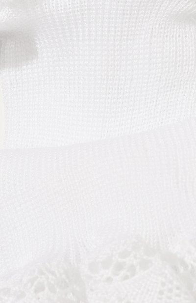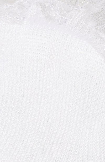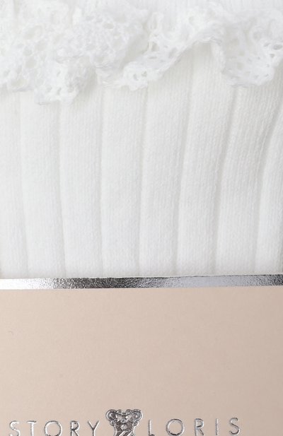 Носки изготовили из мягкого эластичного трикотажа. Аксессуар украсили узкой расклешенной оборкой, выполненной из фатина.