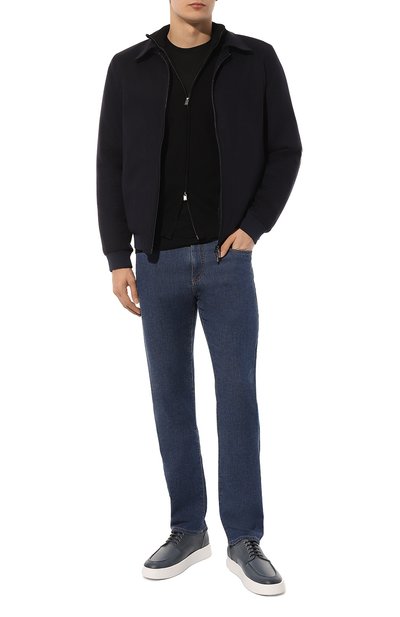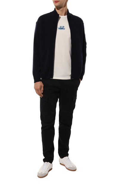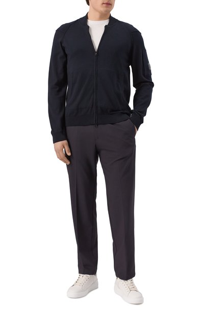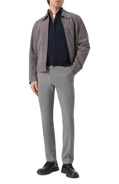 Для изготовления кардигана с рифлеными эластичными манжетами, поясом и высоким воротом использовали мягкую шерсть. Модель застегивается встречной молнией с пуллером-эмблемой, а боковые карманы – потайными.