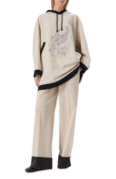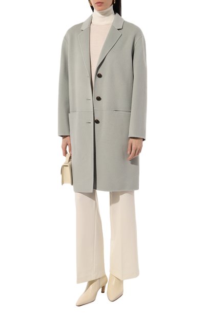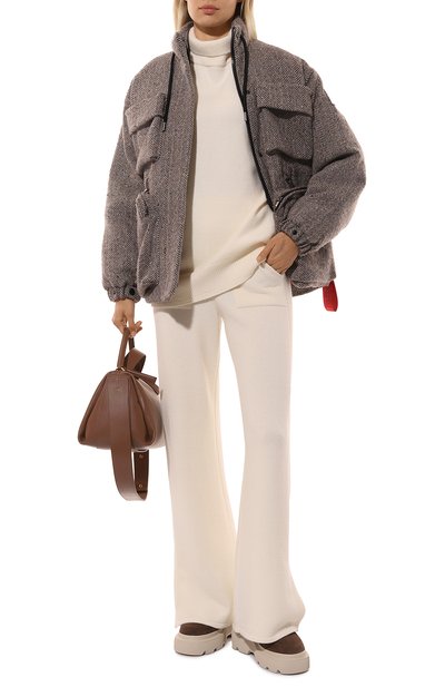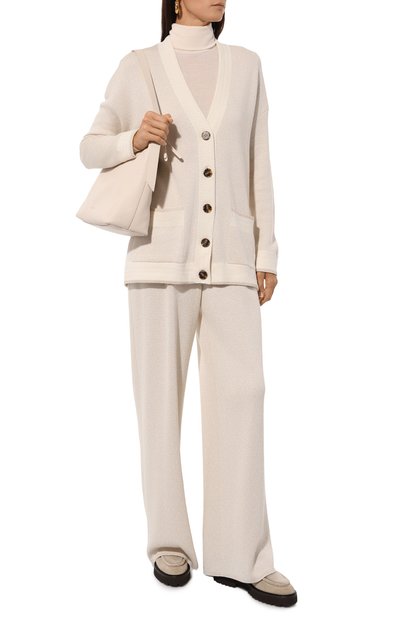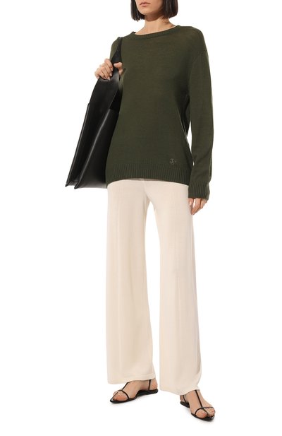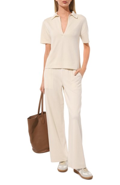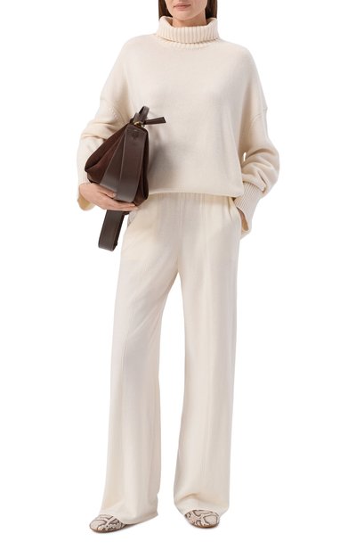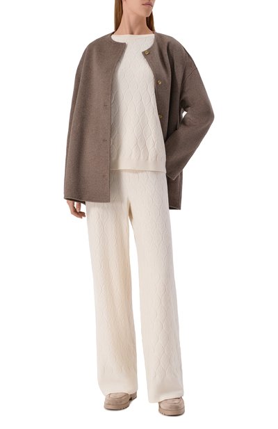 Прямые брюки с боковыми карманами и рельефными застроченными стрелками спереди и сзади связали из шерстяной пряжи с добавлением кашемира. Модель с широким поясом наши стилисты предлагают сочетать со свитером и ботильонами.