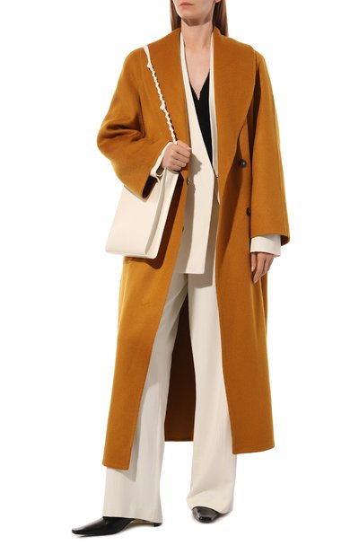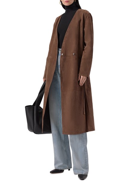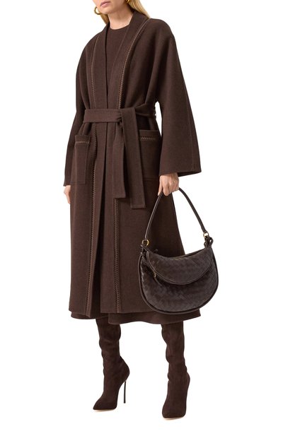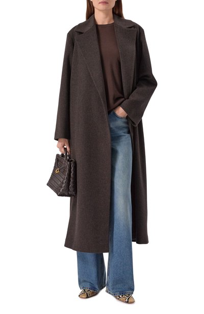 Длинное пальто выполнили из фактурного кашемира, а для изготовления подкладки использовали вискозу. Изделие с широкими заостренными лацканами и потайными кнопками дополнили съемным поясом-лентой.