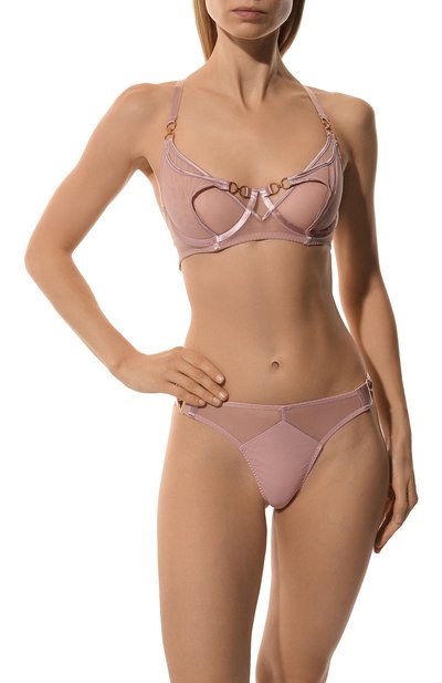 Бюстгальтер-балконет с мягкими чашечками на косточках выполнен из полупрозрачного тюля с узорами, напоминающими витражи из венецианского стекла. Модель с регулируемыми атласными бретелями отделана фестончатым кружевом.