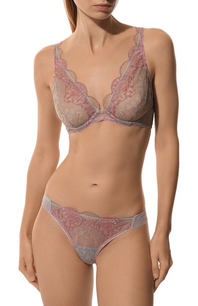 Бюстгальтер Venetian Glass с мягкими треугольными чашечками на косточках выполнили из двухслойного французского кружева. Модель на двух крючках с двумя вариантами объема дополнили регулируемыми брендированными бретелями.