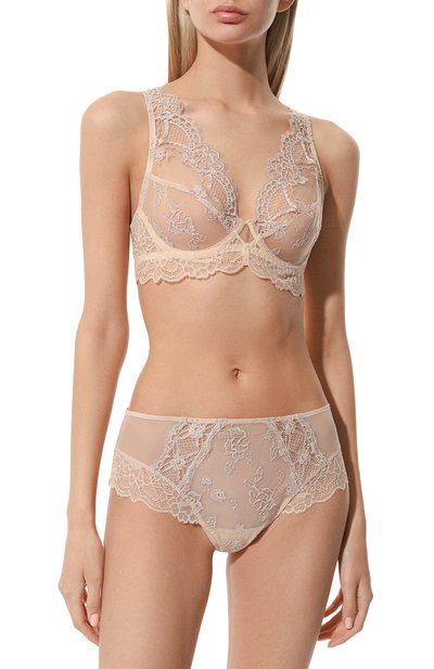 Бюстгальтер Venetian Glass с мягкими треугольными чашечками на косточках выполнили из двухслойного французского кружева. Модель на двух крючках с двумя вариантами объема дополнили регулируемыми брендированными бретелями.