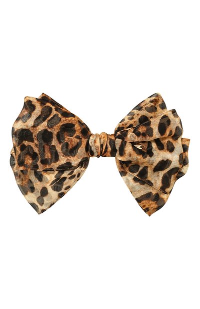 Для изготовления двойного банта использовали полупрозрачный шелк с леопардовым узором. Аксессуар дополнили золотистой брендированной пластиной и фирменным металлическим зажимом.