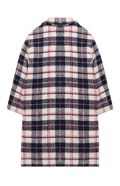Однобортное клетчатое пальто сшили из ткани на основе полиэстера и хлопка с добавлением шерсти и акрила. Для брендированной подкладки выбрали смесовую вискозу. По бокам разместили карманы с клапанами.