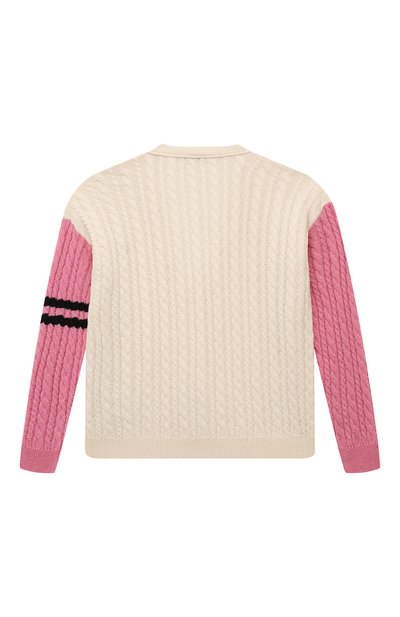 Кардиган с крупным узором в горох в технике интарсия изготовили из мериносовой шерсти. Кайму вдоль горловины, пуговичную планку, манжеты и пояс выполнили фактурной вязкой. Спереди модель дополнили брендированной пластиной.