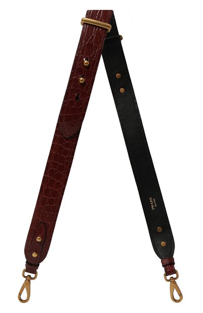 Регулируемый ремень для сумки выполнили из фактурной кожи каймана, выделанной вручную. Аксессуар с золотистыми заклепками крепится к сумке с помощью двух поворотных карабинов из металла.
