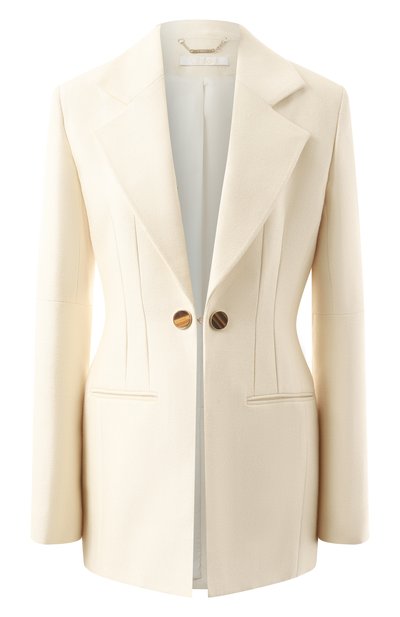 Жакет со шлицей сзади и имитацией двух прорезных карманов выполнили из шелка с добавлением шерсти первого пострига. Изделие с подкладкой из чистого шелка застегивается крючком, который подчеркнули декоративными пуговицами.