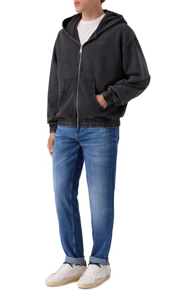Толстовку Kano с фактурной изнанкой выполнили из хлопка. Модель с двумя карманами дополнили вставками из велюра. Из него же выполнили капюшон со светоотражающим шнуром. Цвет оранжевой нашивки поддерживает встречная молния.