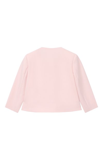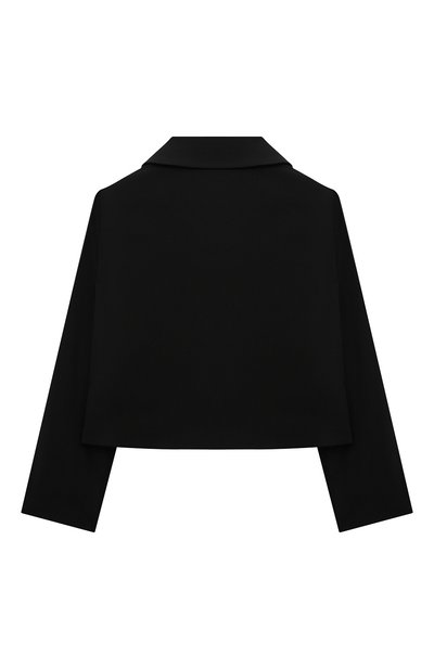 Жакет с пуговицами, украшенными изображением головы льва, выполнили из твида на основе хлопка и акрила. Фактурный узор подчеркнули, добавив в состав металлизированные волокна. Плечи дополнили объемными аппликациями из белого тюля.