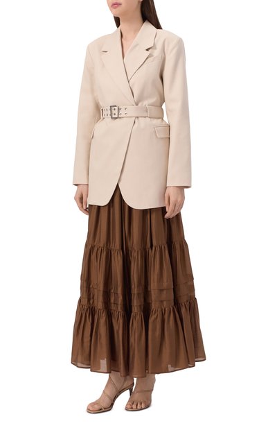 Юбку Juliette с облегающим верхом дополнили широким асимметричным воланом с драпировкой, придающей ему объем. Для пошива модели с потайной молнией сзади использовали вискозную тафту с деликатным блеском.