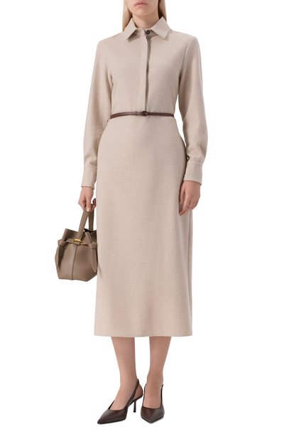 Длинное платье с широкими облегающими манжетами связали из шелковой пряжи, утепленной нежным кашемиром. Модель с шевронными узорами – идеальная основа повседневного образа для прохладной погоды.