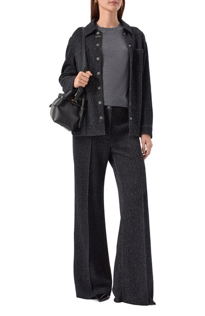 Свободные брюки из кашемирового трикотажа декорировали фактурными полосками по бокам, напоминающими лампасы. Модель дополнили боковыми карманами и высокими разрезами по низу брючин. Под эластичным поясом – имитация ширинки.