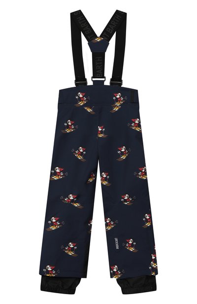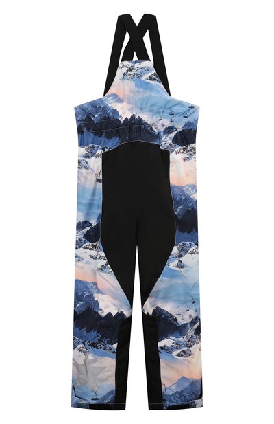 Для пошива комбинезона с цветочным принтом использовали переработанный водоотталкивающий полиэстер. Модель с эластичной вставкой на поясе и регулируемыми подтяжками дополнили светоотражающими деталями и трикотажными гетрами, прикрытыми низом брючин с ремешками велкро. Заднюю и боковые стороны изделия с двумя карманами усилили широкими контрастными накладками.