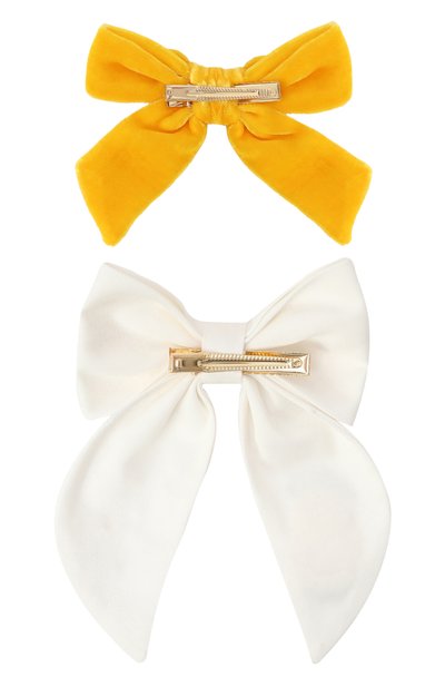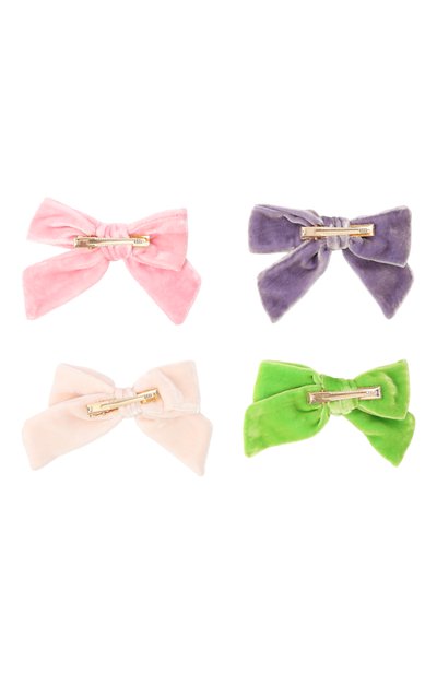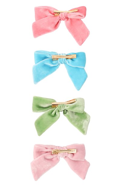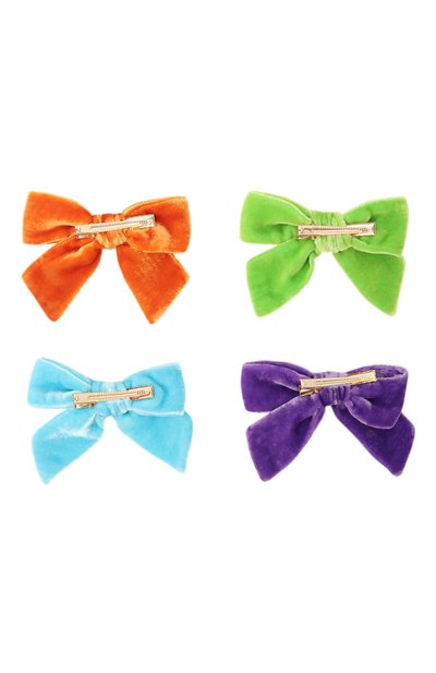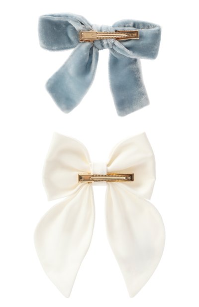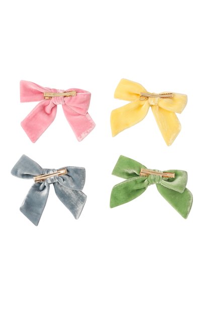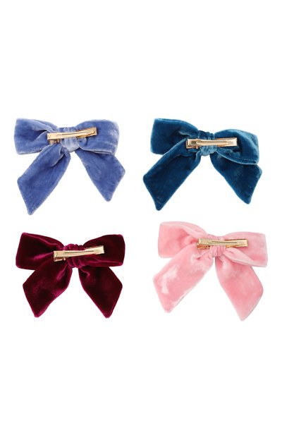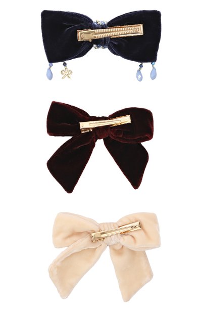 Два банта выполнили из бархата разных оттенков, а для изготовления третьего использовали атласную ленту с оборками по краям. Аксессуары фиксируются на волосах золотистыми металлическими зажимами.