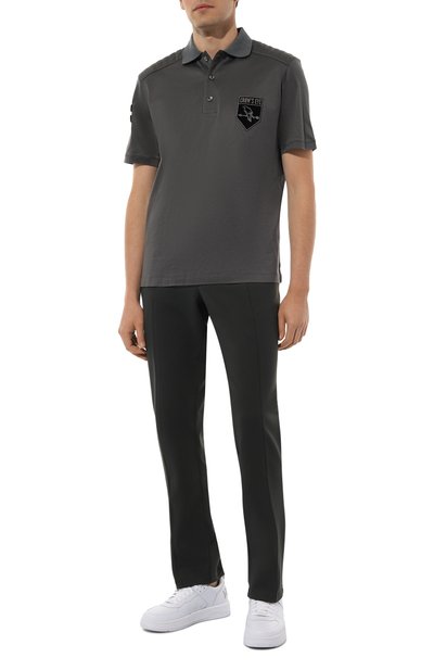 Прямые брюки с боковыми карманами и прорезным задним на молнии сшили из эластичного трикотажа на основе полиамида и хлопка. Пояс дополнили регулируемой кулиской с люверсами, один из которых окрашен в алый цвет.