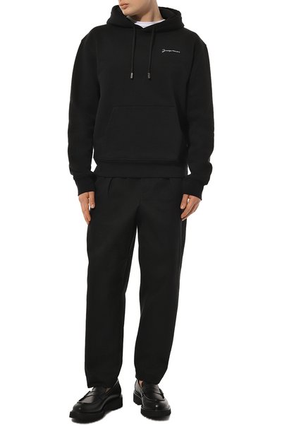Для пошива худи использовали эластичный материал на основе полиами да и хлопка. Изделие с глубоким капюшоном застегивается короткой молнией, рядом с которой разместили брендированный патч. Рукава со спущенной линией плеч дополнили манжетами с прорезью для большого пальца.