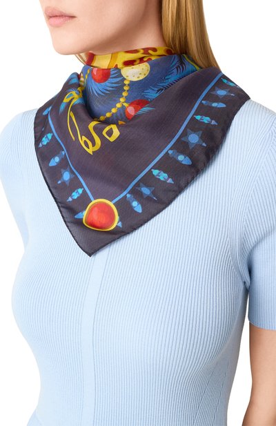 Платок украсили изображением Суздаля, на создание которого ху дожника Александра Ерашова вдохновили старинные гравированные карты и лубочные картины. Края квадратного аксессуара из шелкового твила подшили вручную.