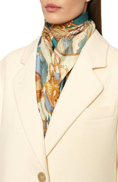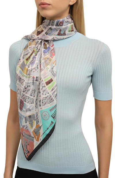 Шелковый платок украсили принтом, который художница Марина Усачева создала на основе образов, знаковых для грузинской культуры. Портрет царицы Тамары, изображение гор, храма и дворика соседствуют с хевсурскими орнаментами, а объединяет их красный фон, напоминающий старинные эмали и фрески.