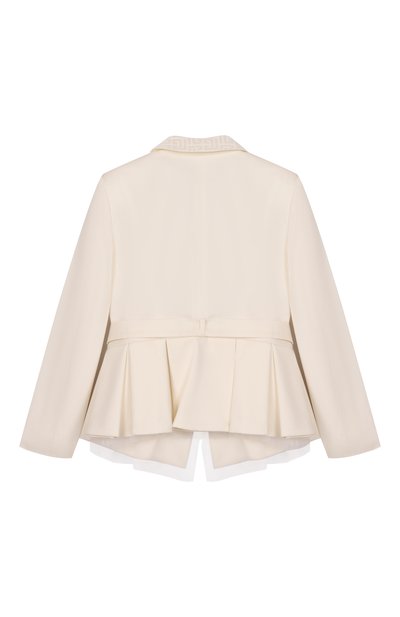 Двубортный жакет с заостренными лацканами выполнили из эластичной шерсти. Роль декора модели с внешним карманом отдали объемной пуговицам Lion Head и аппликации в виде цветочного бутона из тюля.
