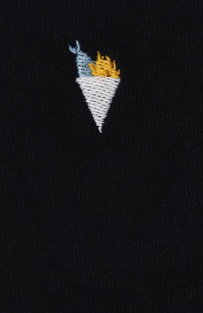 Для создания носков использовали пряжу из органического хлопка и полиамида. Аксессуар с широкой эластичной манжетой и плоским швом на мысе украшен сбоку небольшой вышивкой.